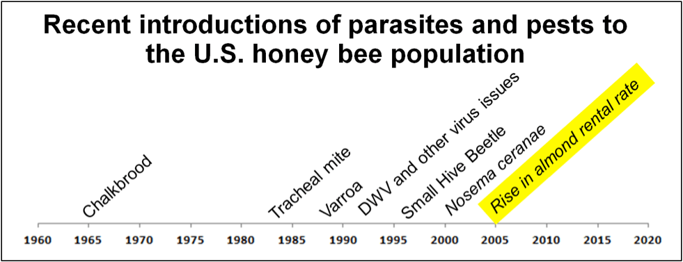 Slika 1. Uticaj najezde novih parazita kulminirao je ozbiljnim nedostatkom pčela za oprašivanje badema zimi 2004/2005. Kao što je još gore, još uvek imamo još potencijalnih napadača – briga o Tropilaelapsu, Vespa velutina i patuljastog meda (Apis florea).