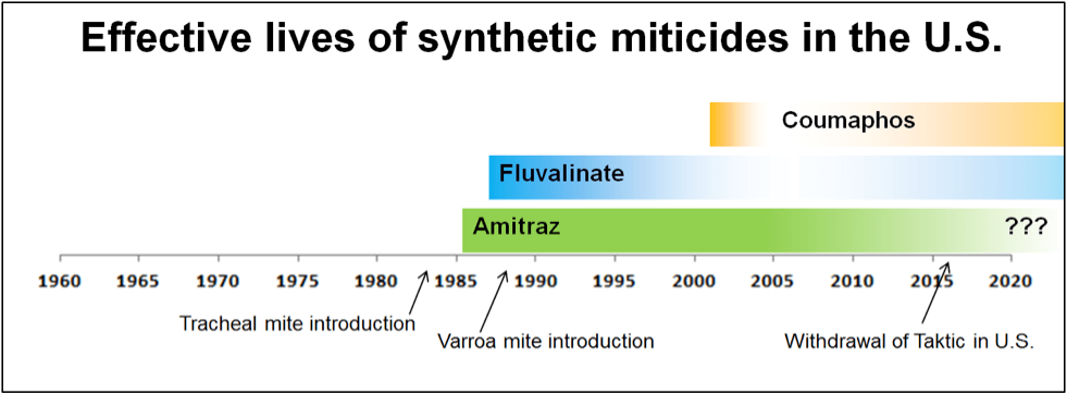U Kaliforniji, kumafos je postao nedeletvoran nakon samo tri sezone korištenja. Amitraz, na moje veliko iznenađenje, kontinuirano (i prilično uspešno) koriste mnogi pčelari vec 15 godina. Ali čini se da je evolucija napokon uhvaćena s amitrazom (Slika 3.) i postoje znakovi da se stvari možda mijenjaju …
